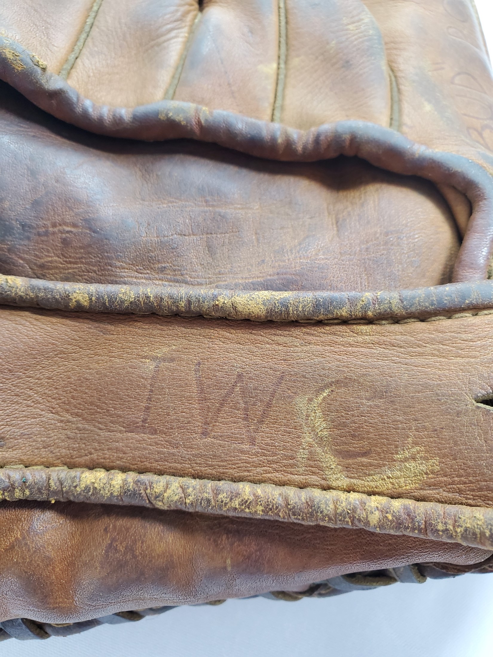 1940’s Dick Wakefield Wilson Baseball Glove – Model 625 Streamlined Kurv-Form Finger Pat No. 2291204. The glove measures 10″ from top of index finger to the heel of the glove and would be used by someone who throws with their left hand. The strap on the back of the glove has the letters IWC on it which is original to the glove. The name “Bud” Powell is also written on the glove which is not original to it.