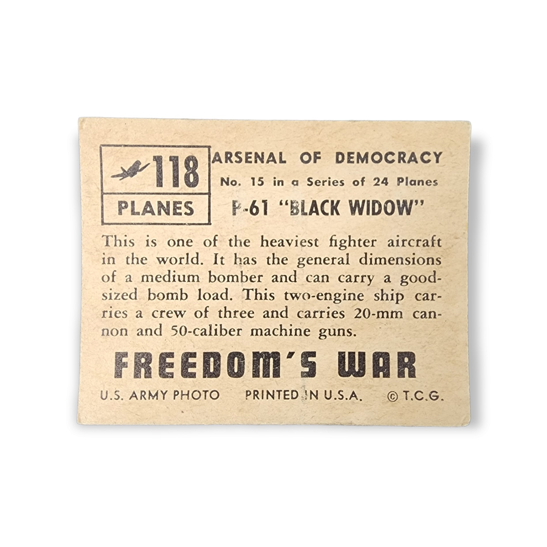1950 Topps Freedom War #118 P-61 Black Widow Arsenal of Democracy Planes Non-Sport Trading Card. This card has the tan color card back variation.