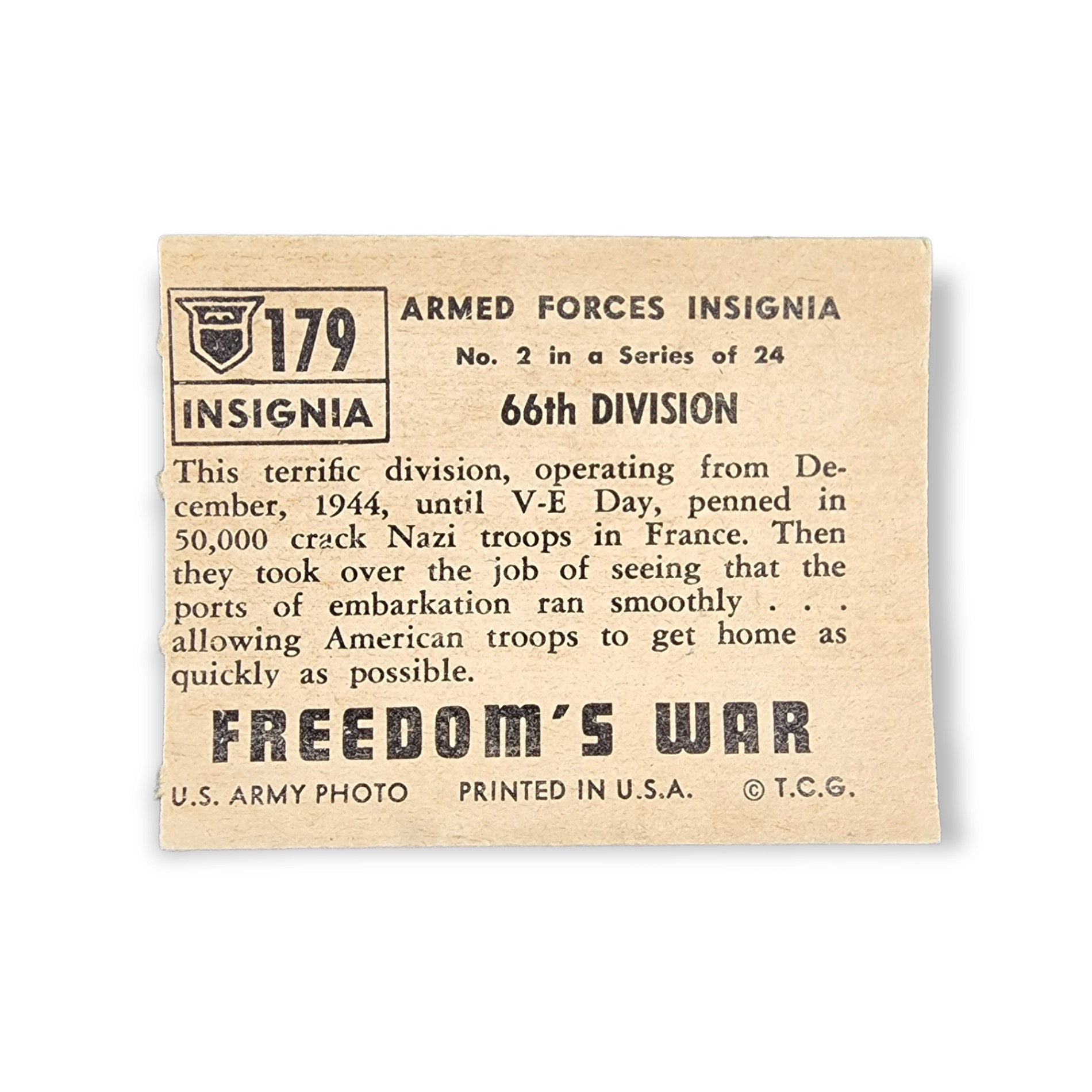 1950 Topps Freedom War #179 66th Division Armed Forces Insignia Non-Sport Trading Card. This card has the tan color card back variation.