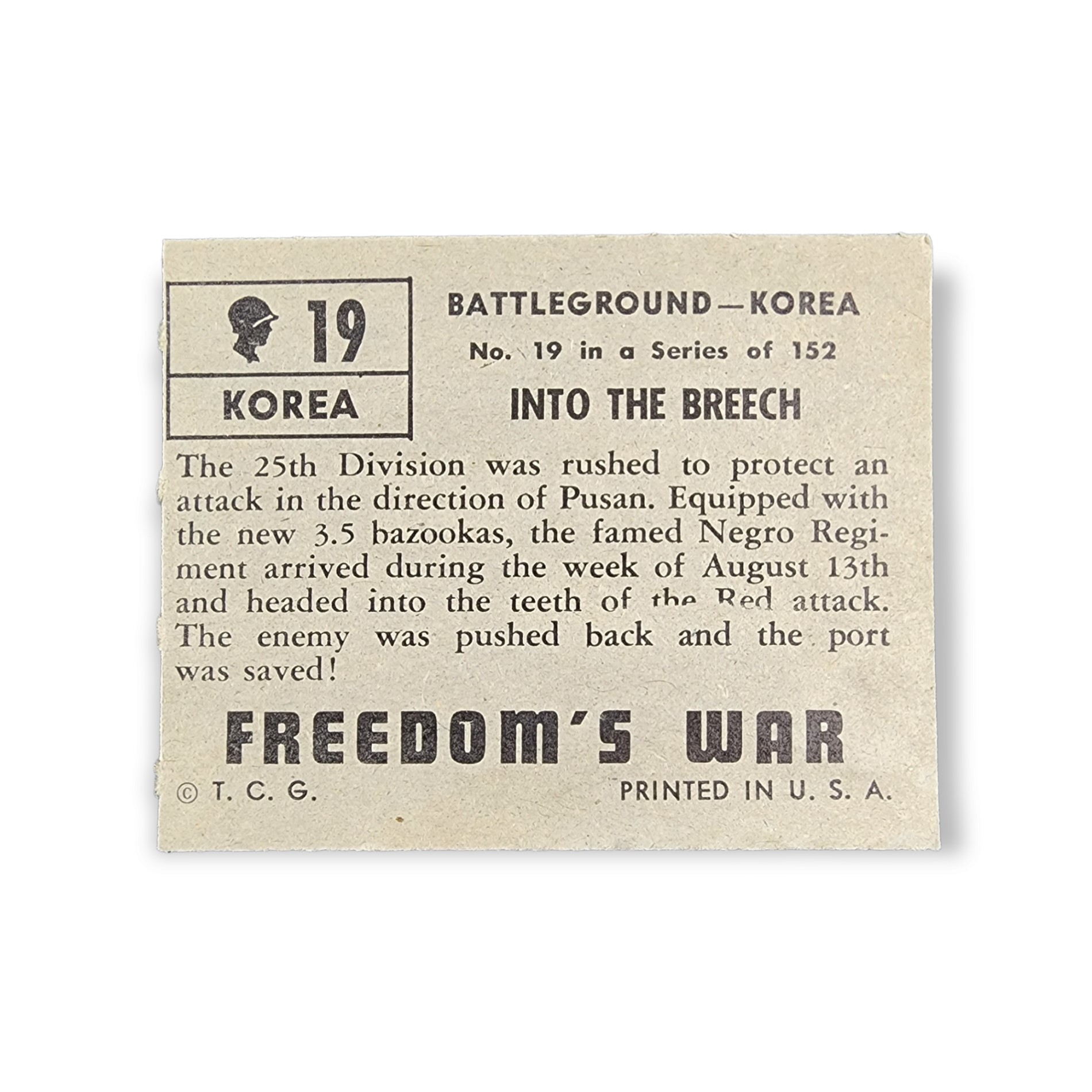 1950 Topps Freedom War #19 Into the Breech Battleground Korea Non-Sport Trading Card. This card has the grey color card back variation.