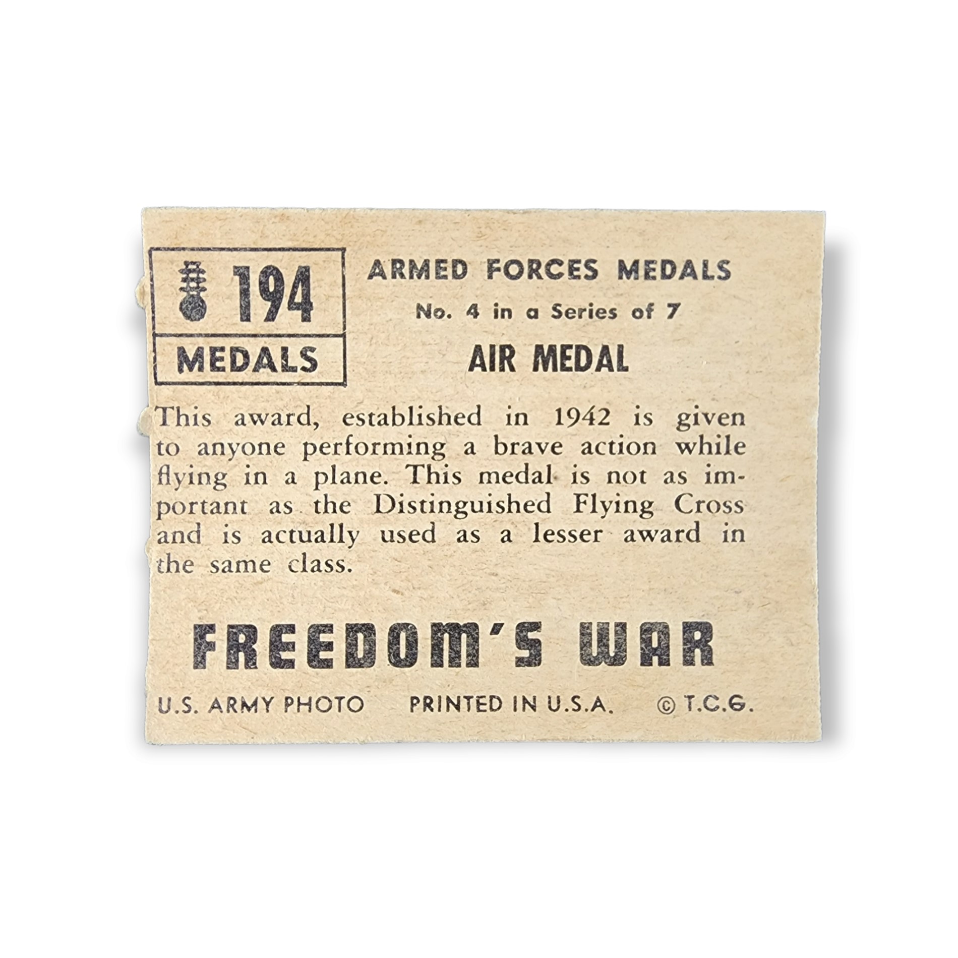1950 Topps Freedom War #194 Air Medal Armed Forces Insignia Non-Sport Trading Card. This card has the tan color card back variation.