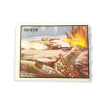 The 1950 Topps Freedom’s War set contains 203 cards featuring scenes from the Korean War. The set was issued in two-card panels, with each card measuring 2 1/16″ x 2 5/8″, and were perforated on one of the sides. The Freedom’s War cards feature airplanes, ships, weapons, medals, generals, enemies, and tanks. The front of the card has an actual photo or artwork representation while the back of the card has a short description and the card number. The 1950 Topps Freedom’s War cards were released in three print runs, over a period of two years, and can have either a grey or tan cardboard reverse.