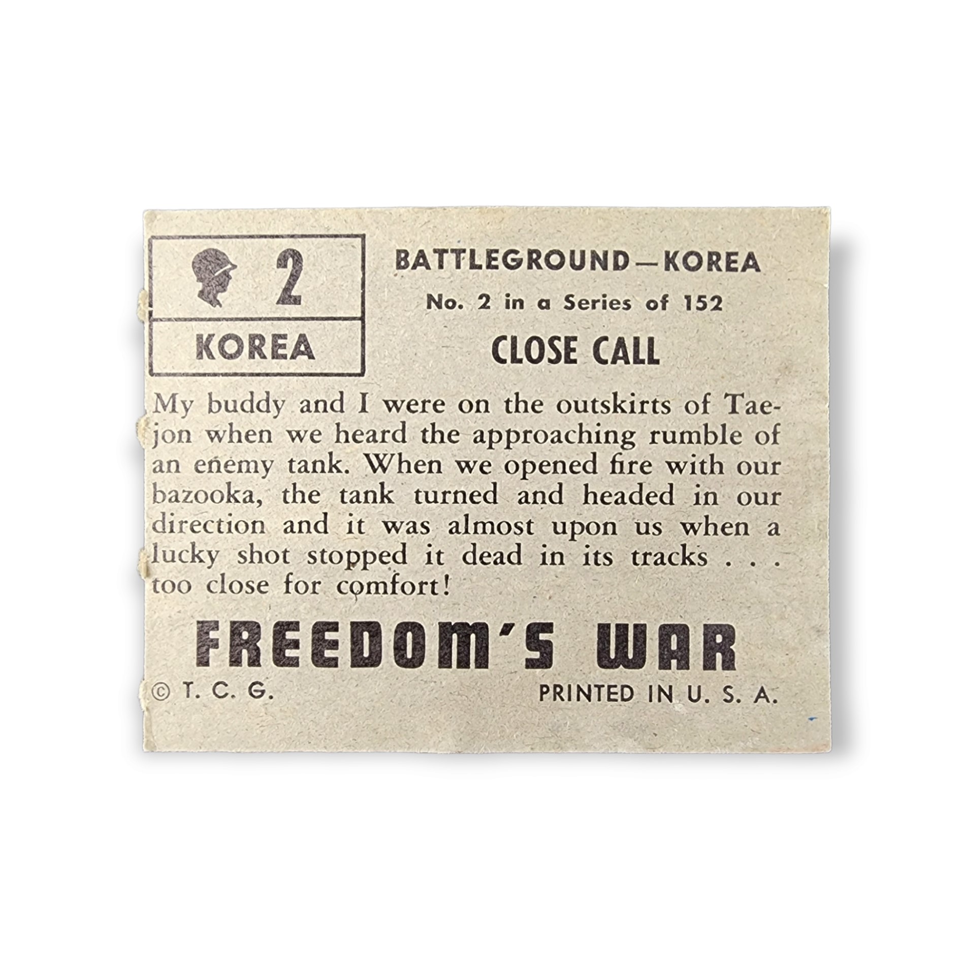 1950 Topps Freedom War #2 Close Call Battleground Korea Non-Sport Trading Card. This card has the grey color card back variation.