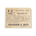 1950 Topps Freedom War #22 Point-Blank Fire Battleground Korea Non-Sport Trading Card. This card has the tan color card back variation.