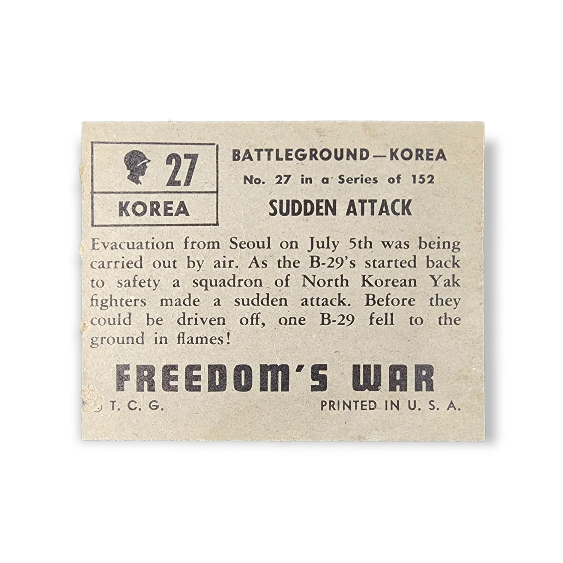 1950 Topps Freedom War #27 Sudden Attack Battleground Korea Non-Sport Trading Card. This card has the grey color card back variation.