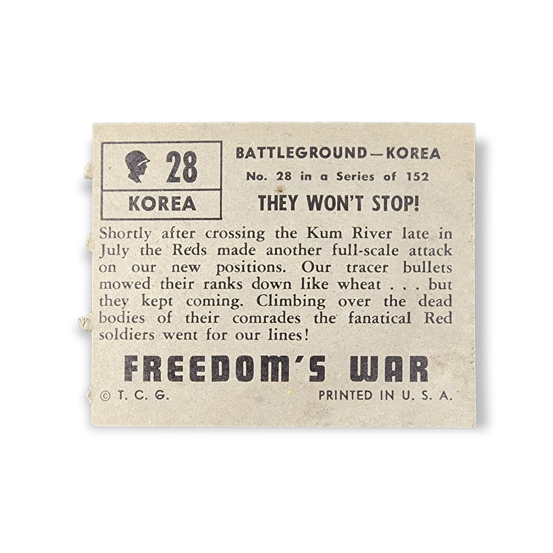 1950 Topps Freedom War #28 They Won’t Stop Battleground Korea Non-Sport Trading Card. This card has the grey color card back variation.