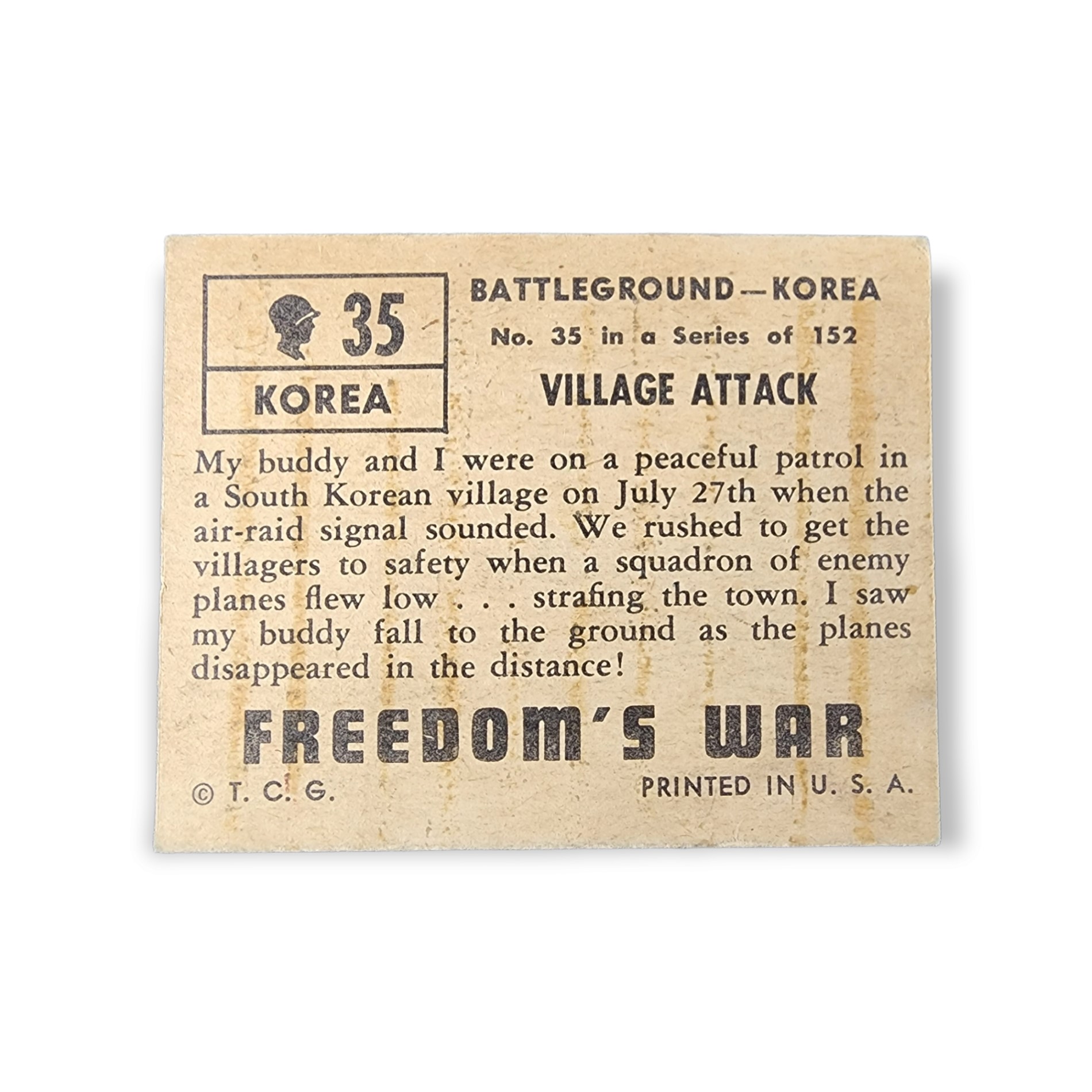 1950 Topps Freedom War #35 Village Attack Battleground Korea Non-Sport Trading Card. This card has the tan color card back variation.