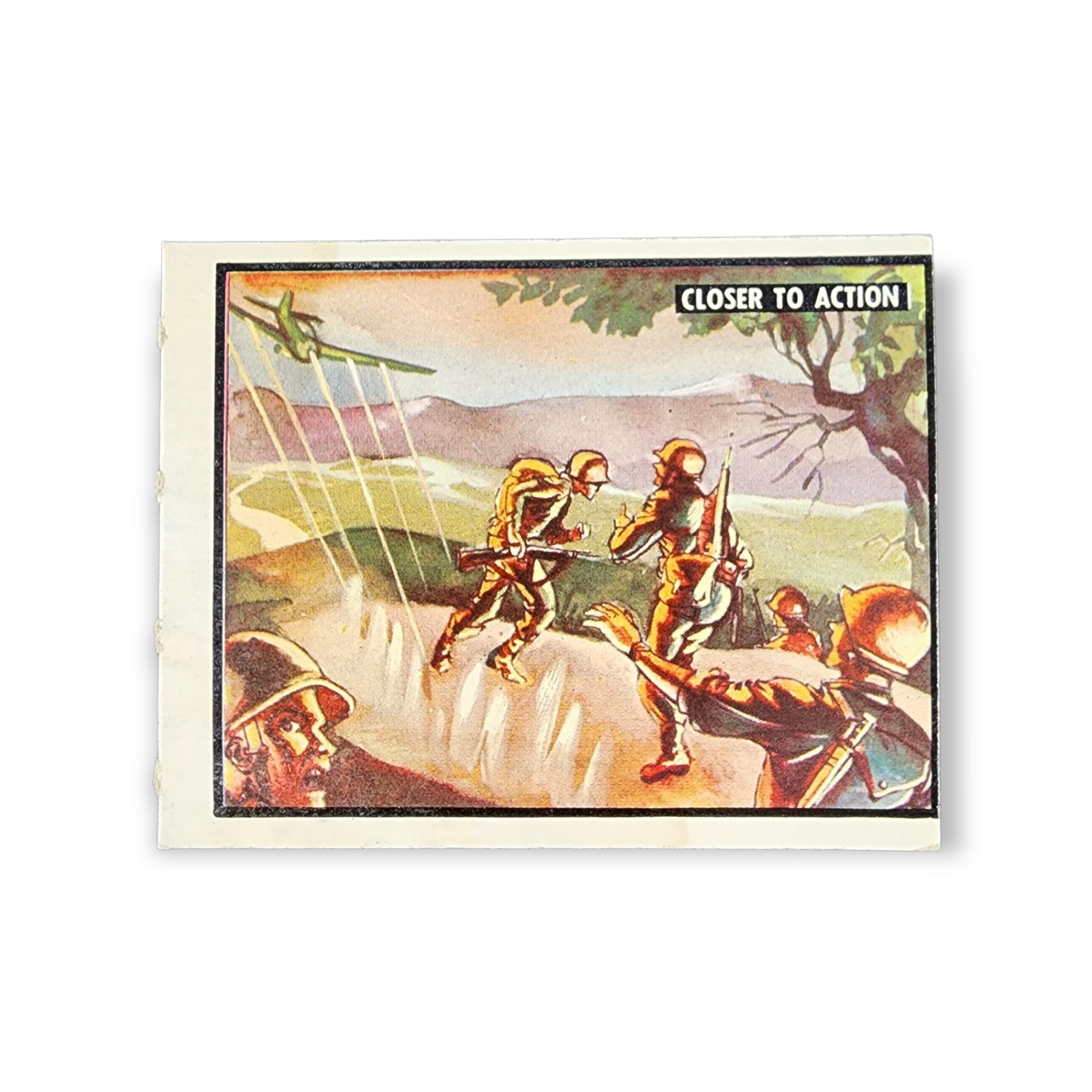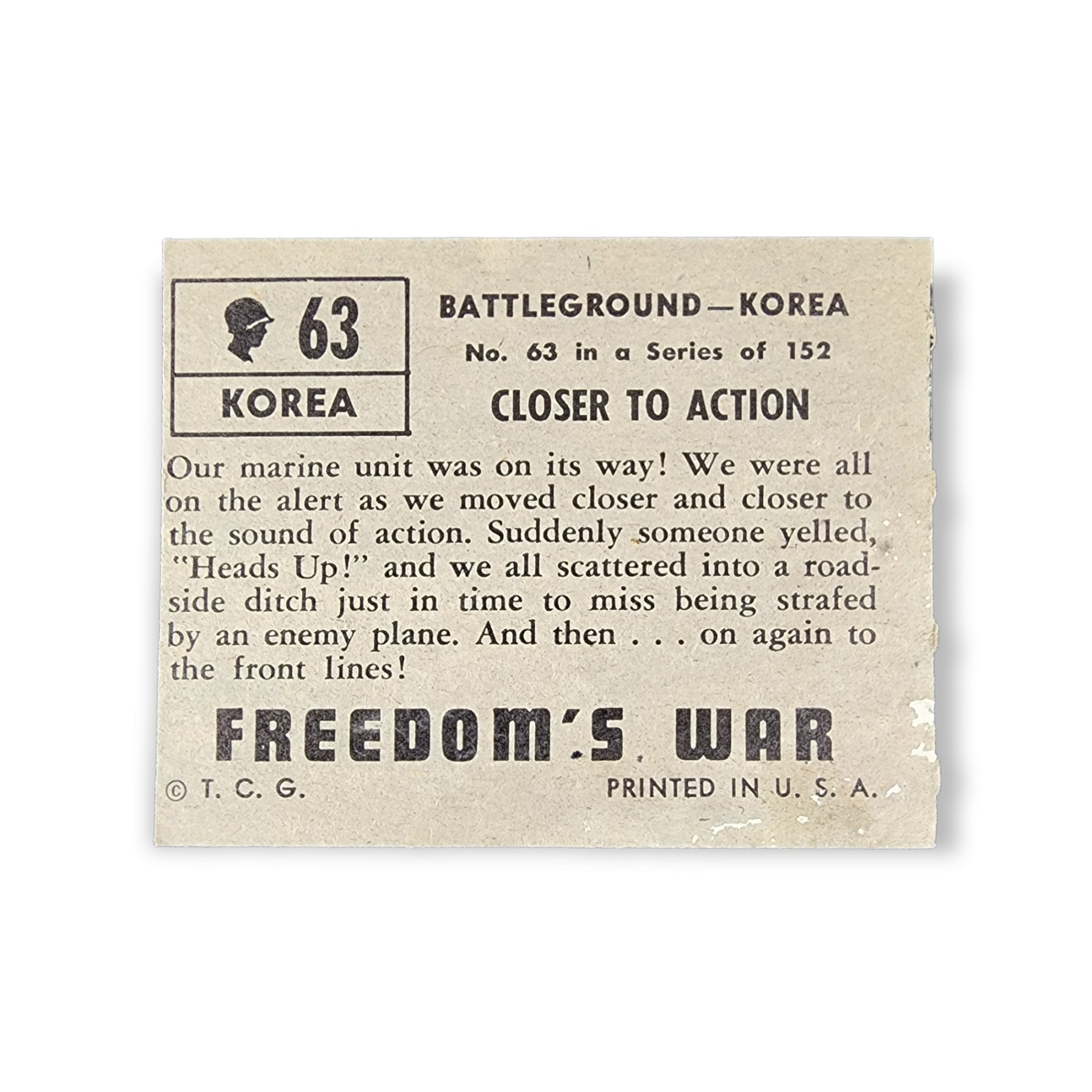 1950 Topps Freedom War #63 Closer to Action Battleground Korea Non-Sport Trading Card. This card has the grey color card back variation.