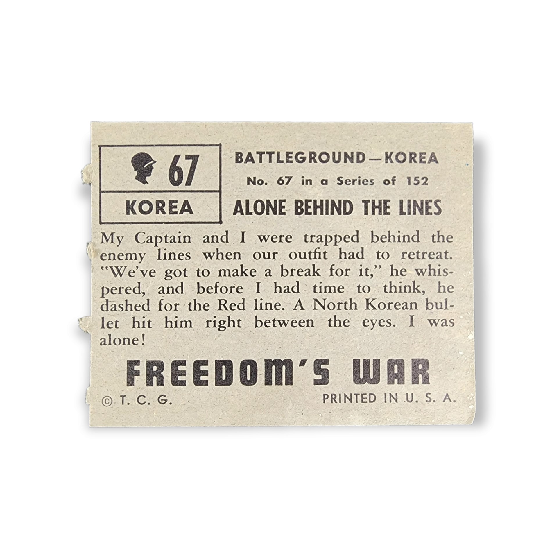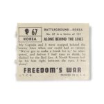 1950 Topps Freedom War #67 Alone Behind the Lines Battleground Korea Non-Sport Trading Card. This card has the grey color card back variation.