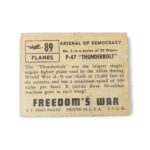 1950 Topps Freedom War Trading Card #89 P-47 Thunderbolt – Arsenal of Democracy Planes Tan Back Variation. The 1950 Topps Freedom’s War set contains 203 cards featuring scenes from the Korean War. The set was issued in two-card panels, with each card measuring 2 1/16″ x 2 5/8″, and perforated on one side. The Freedom’s War cards feature airplanes, battleships, weapons, medals, generals and die-cut tanks. The 1950 Topps Freedom’s War cards were distributed in three printings, over a period of two years, and can have backs with either grey or tan cardboard. Due to the cards age, there may be creases, stains, scratches, spots where the original paper has peeled, writing or other imperfections so please carefully review all available images.