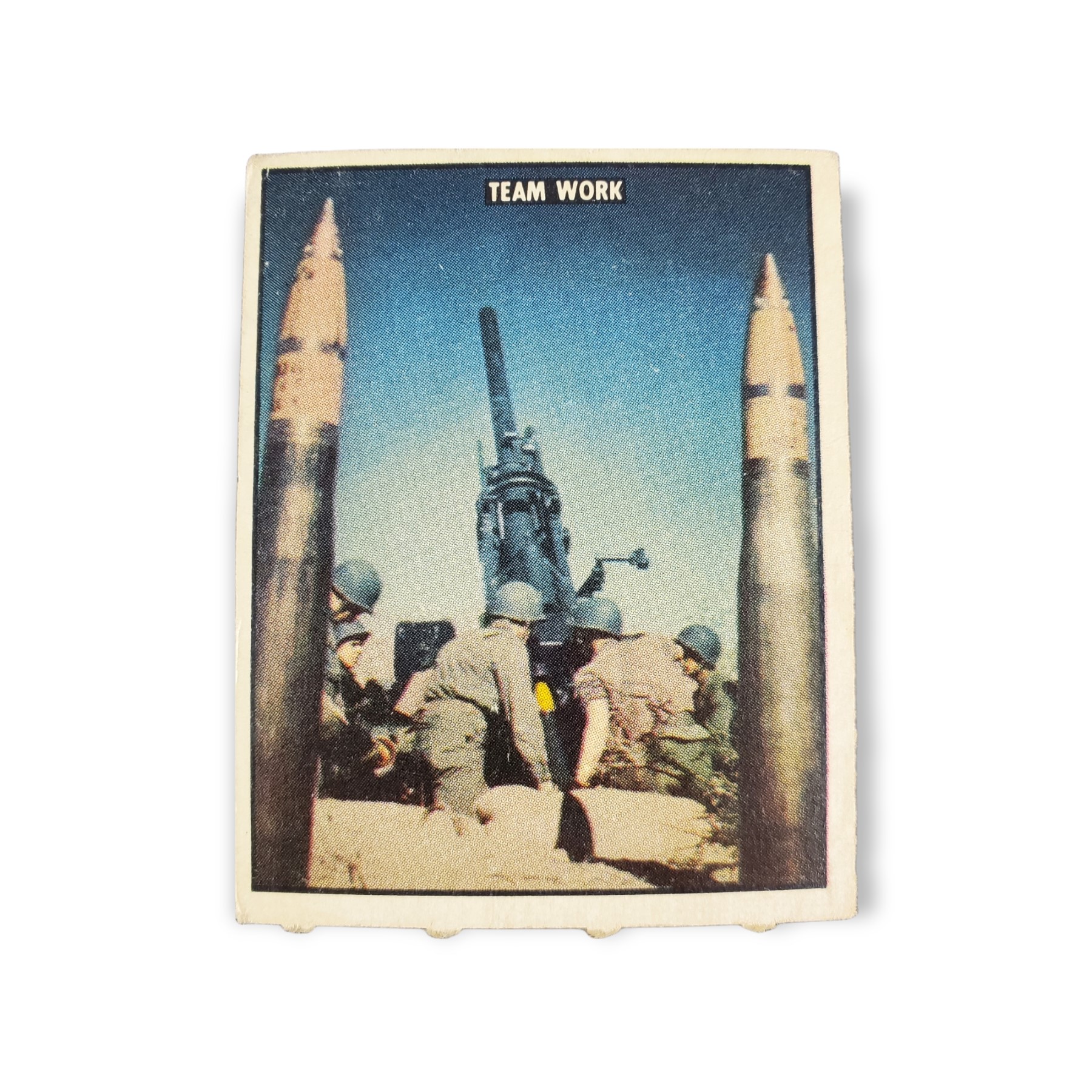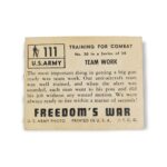 1950 Topps Freedom War Trading Card #111 Team Work – Training for Combat Tan Back Variation. The 1950 Topps Freedom’s War set contains 203 cards featuring scenes from the Korean War. The set was issued in two-card panels, with each card measuring 2 1/16″ x 2 5/8″, and perforated on one side. The Freedom’s War cards feature airplanes, battleships, weapons, medals, generals and die-cut tanks. The 1950 Topps Freedom’s War cards were distributed in three printings, over a period of two years, and can have backs with either grey or tan cardboard. Due to the cards age, there may be creases, stains, scratches, spots where the original paper has peeled, writing or other imperfections so please carefully review all available images.