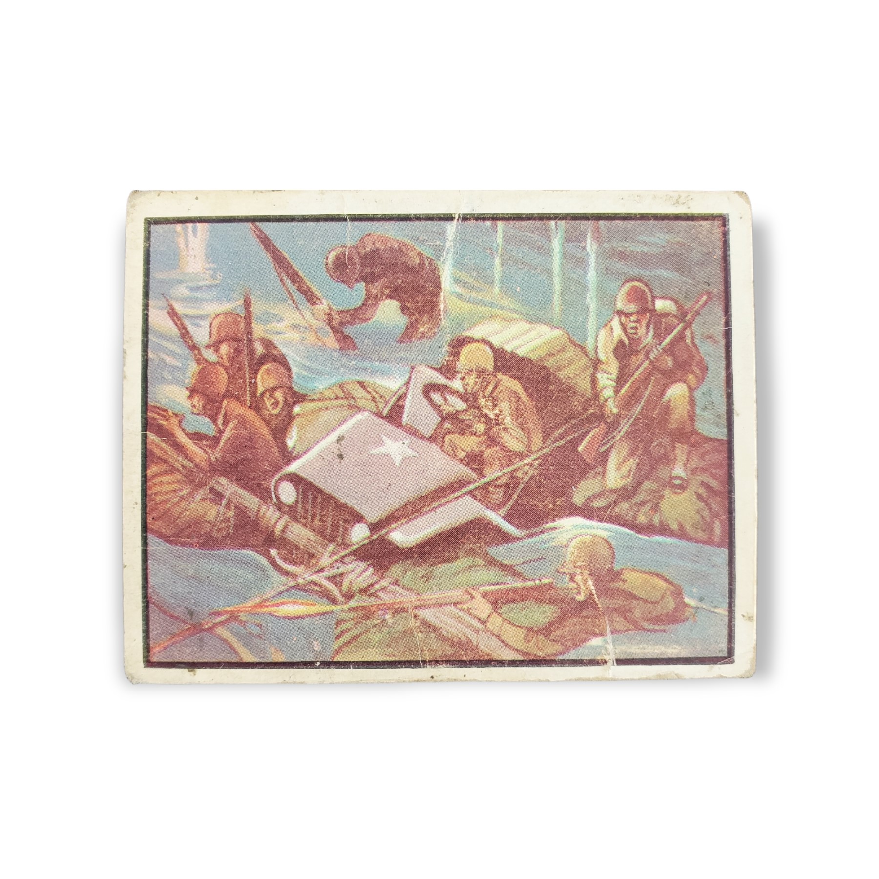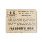 1950 Topps Freedom War Trading Card #17 Keep Moving! – Battleground Korea Tan Back Variation. The 1950 Topps Freedom’s War set contains 203 cards featuring scenes from the Korean War. The set was issued in two-card panels, with each card measuring 2 1/16″ x 2 5/8″, and perforated on one side. The Freedom’s War cards feature airplanes, battleships, weapons, medals, generals and die-cut tanks. The 1950 Topps Freedom’s War cards were distributed in three printings, over a period of two years, and can have backs with either grey or tan cardboard. Due to the cards age, there may be creases, stains, scratches, spots where the original paper has peeled, writing or other imperfections so please carefully review all available images.