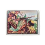 1950 Topps Freedom War Trading Card #25 Bouncing Bullets – Battleground Korea Tan Back Variation. The 1950 Topps Freedom’s War set contains 203 cards featuring scenes from the Korean War. The set was issued in two-card panels, with each card measuring 2 1/16″ x 2 5/8″, and perforated on one side. The Freedom’s War cards feature airplanes, battleships, weapons, medals, generals and die-cut tanks. The 1950 Topps Freedom’s War cards were distributed in three printings, over a period of two years, and can have backs with either grey or tan cardboard. Due to the cards age, there may be creases, stains, scratches, spots where the original paper has peeled, writing or other imperfections so please carefully review all available images.