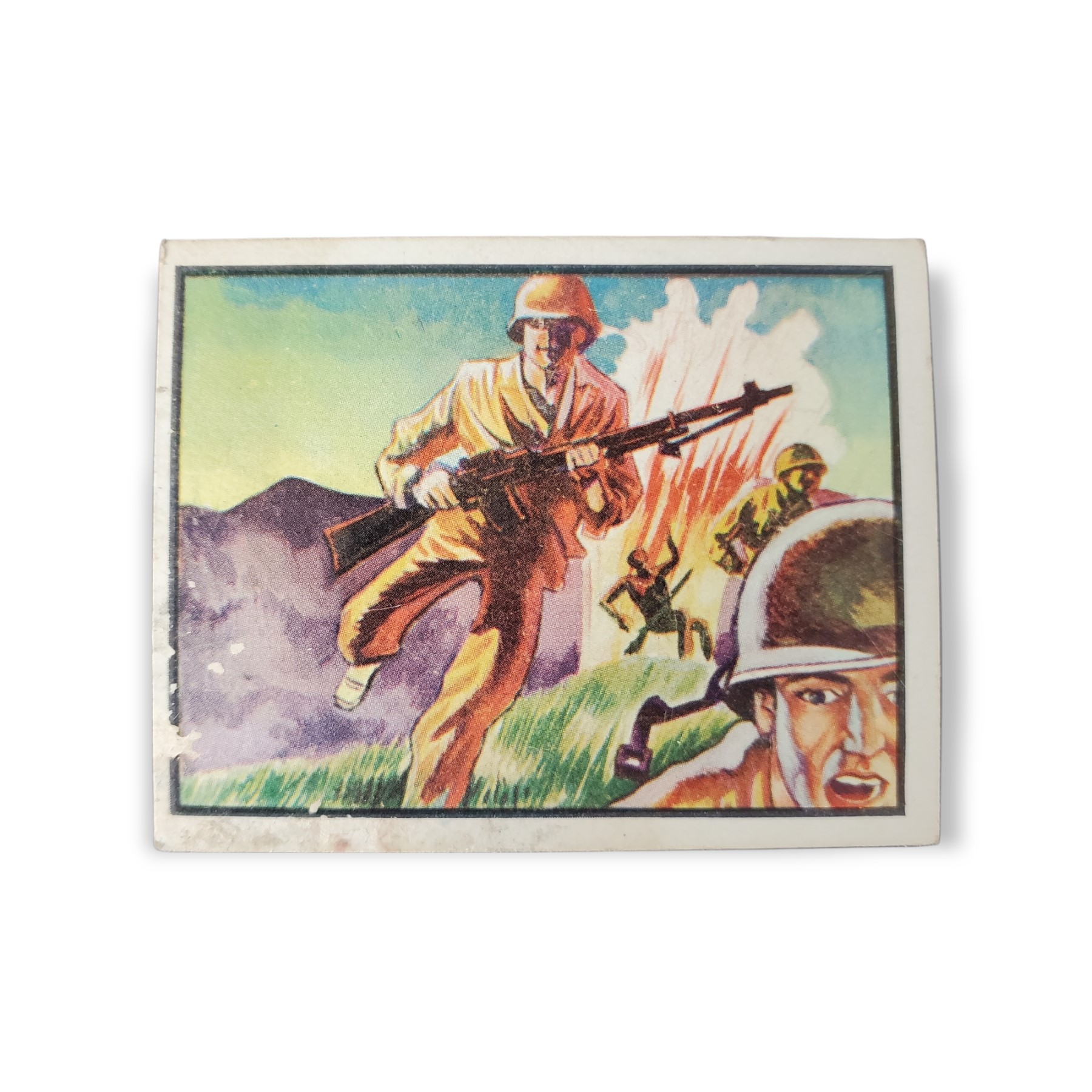1950 Topps Freedom War Trading Card #50 White Phosphorous – Battleground Korea Tan Back Variation. The 1950 Topps Freedom’s War set contains 203 cards featuring scenes from the Korean War. The set was issued in two-card panels, with each card measuring 2 1/16″ x 2 5/8″, and perforated on one side. The Freedom’s War cards feature airplanes, battleships, weapons, medals, generals and die-cut tanks. The 1950 Topps Freedom’s War cards were distributed in three printings, over a period of two years, and can have backs with either grey or tan cardboard. Due to the cards age, there may be creases, stains, scratches, spots where the original paper has peeled, writing or other imperfections so please carefully review all available images.