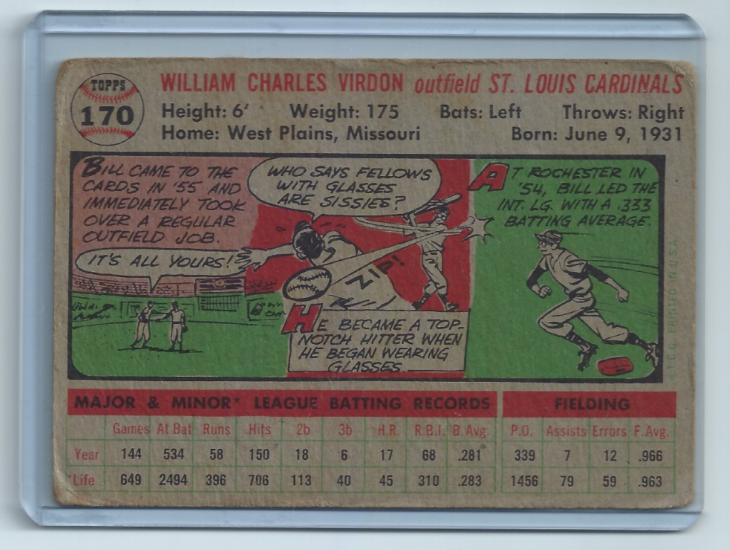 1956 Topps Bill Virdon St. Louis Cardinals MLB Baseball Trading Card #170 for sale. Please take the time to review the listings front and back images so you have a complete idea of the cards condition. These high quality, exceptionally detailed scans that do a great job of accurately showing details as well as the cards condition. These are vintage topps baseball cards, all being atleast 40+ years old so some may have creases, rounded corners, a pen mark or small tear. If the imperfection or detail can plainly be seen in the scans it is up to you to look at the photos before bidding. If you have questions about something please let us know and you should recieve a response within 24 hours.