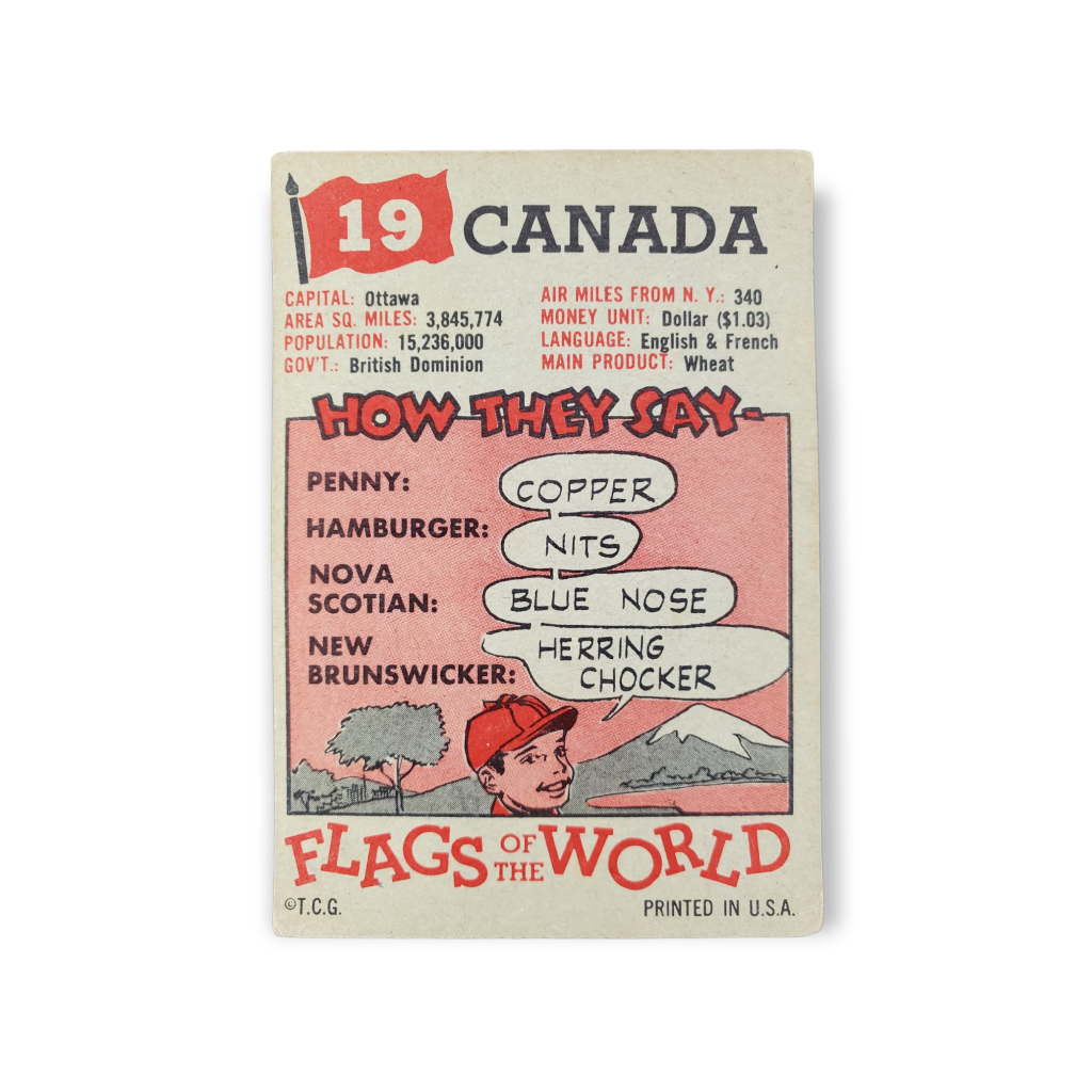 1956 Topps Flags of the World Trading Card #19 Canada. This card measures approximately 2 1/2″ X 3 3/4″.