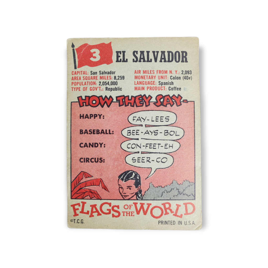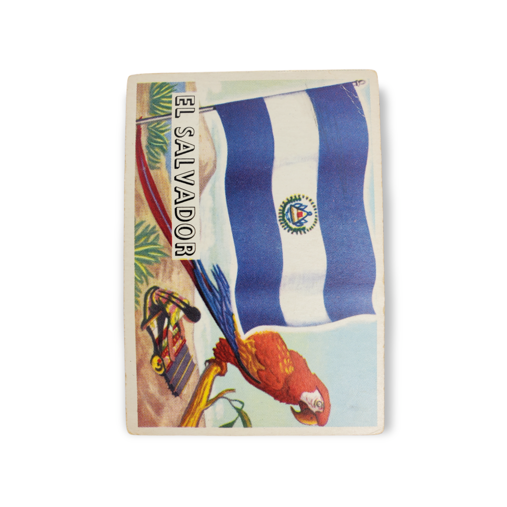 1956 Topps Flags of the World Trading Card #3 El Salvador. This card measures approximately 2 1/2″ X 3 3/4″.
