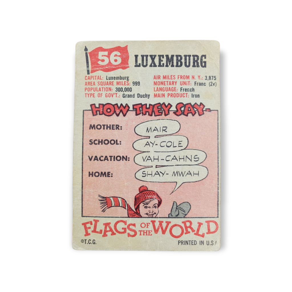1956 Topps Flags of the World Trading Card #56 Luxemburg. This card measures approximately 2 1/2″ X 3 3/4″.