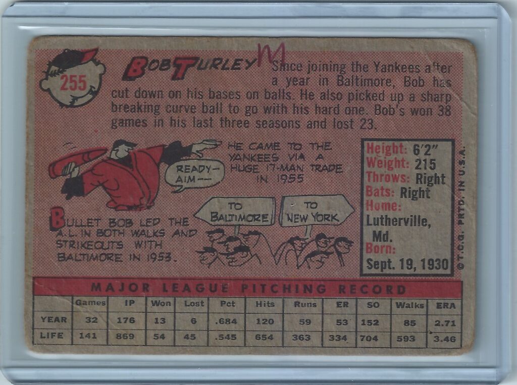 Home Shop Sports Trading Cards Baseball Cards 1958 Topps Bob Turley New York Yankees Vintage Baseball Trading Card #255