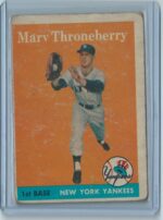 1958 Topps Marv Throneberrry New York Yankees MLB Baseball Trading Card #175 for sale. Please take the time to review the listings front and back images so you have a complete idea of the cards condition. These high quality, exceptionally detailed scans that do a great job of accurately showing details as well as the cards condition. These are vintage topps baseball cards, all being atleast 40+ years old so some may have creases, rounded corners, a pen mark or small tear. If the imperfection or detail can plainly be seen in the scans it is up to you to look at the photos before bidding. If you have questions about something please let us know and you should recieve a response within 24 hours.