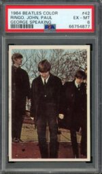 1964 Topps Beatles Color #42 PSA 6 EX-NM Ringo, John, Paul – George Speaking Trading Card – This card has been professionally graded & authenticated by Professional Sports Authenticator (PSA). This card and grade have a population (POP) of 6.