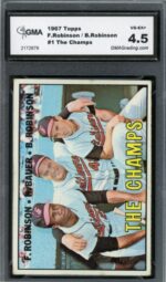 1967 Topps Frank Robinson / Hank Bauer / Brooks Robinson The Champs Baltimore Orioles Baseball Card #1 – GMA Professional Graded 4.5 VG-EX+