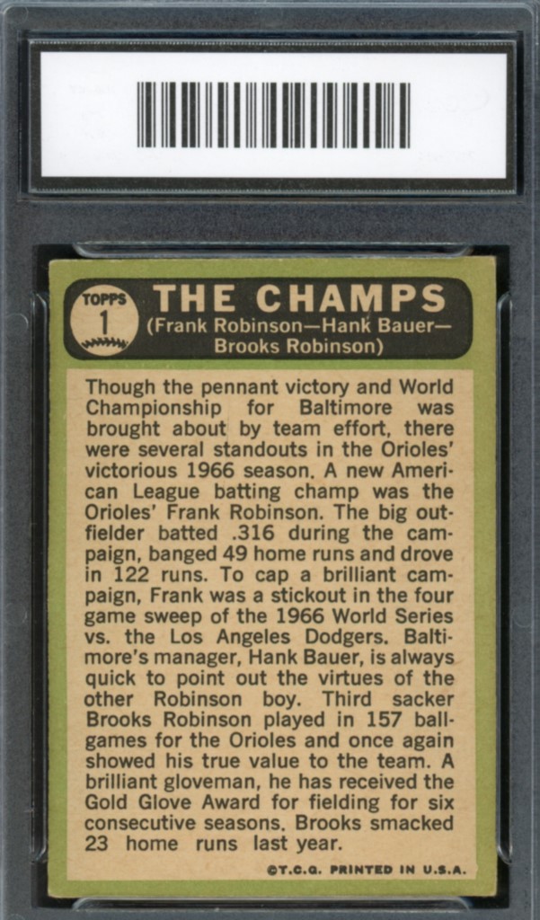 1967 Topps Frank Robinson / Hank Bauer / Brooks Robinson The Champs Baltimore Orioles Baseball Card #1 – GMA Professional Graded 4.5 VG-EX+