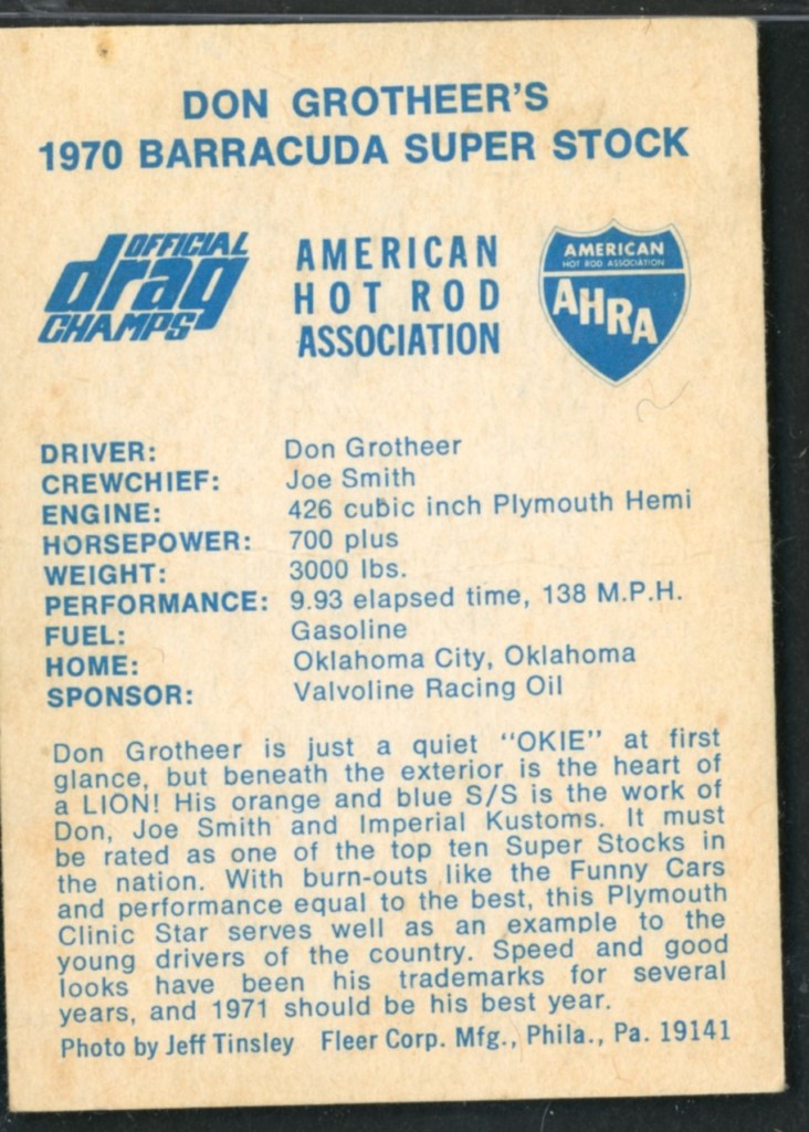 1971 Fleer AHRA Official Drag Champs Trading Card #40 Don Grotheer’s 1970 Barracuda Super Stock