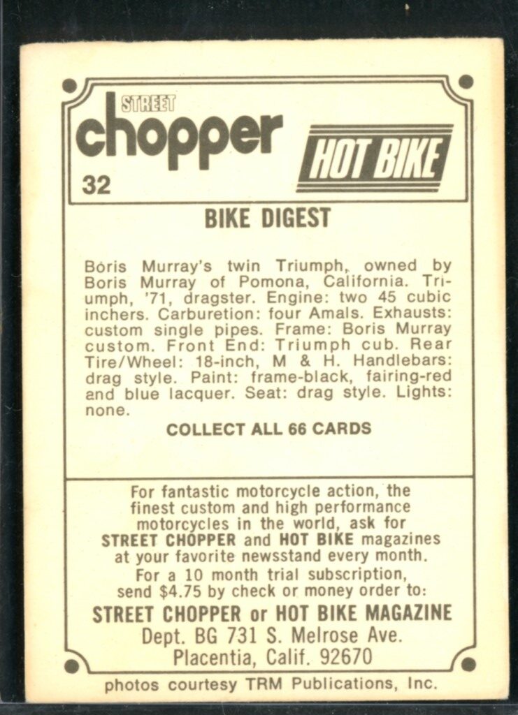 1972 Donruss Choppers & Hot Bikes Trading Card #32 Boris Murray’s Twin Triumph