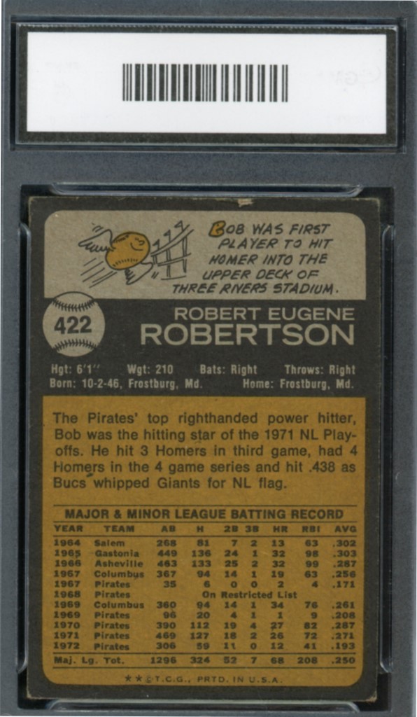 1973 Topps Bob Robertson Pittsburgh Pirates Baseball Card #422 – GMA Professional Graded 4 VG-EX
