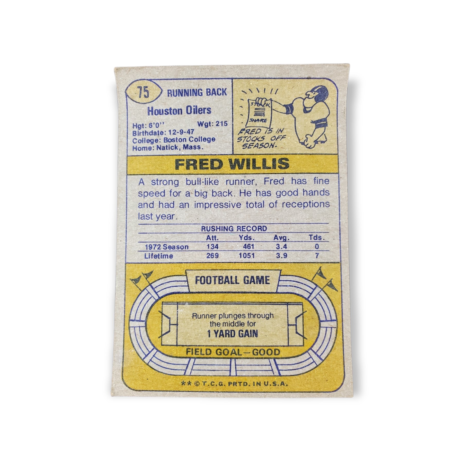 1974 Topps Football Fred Willis Card #75 Houston Oilers Trading Card