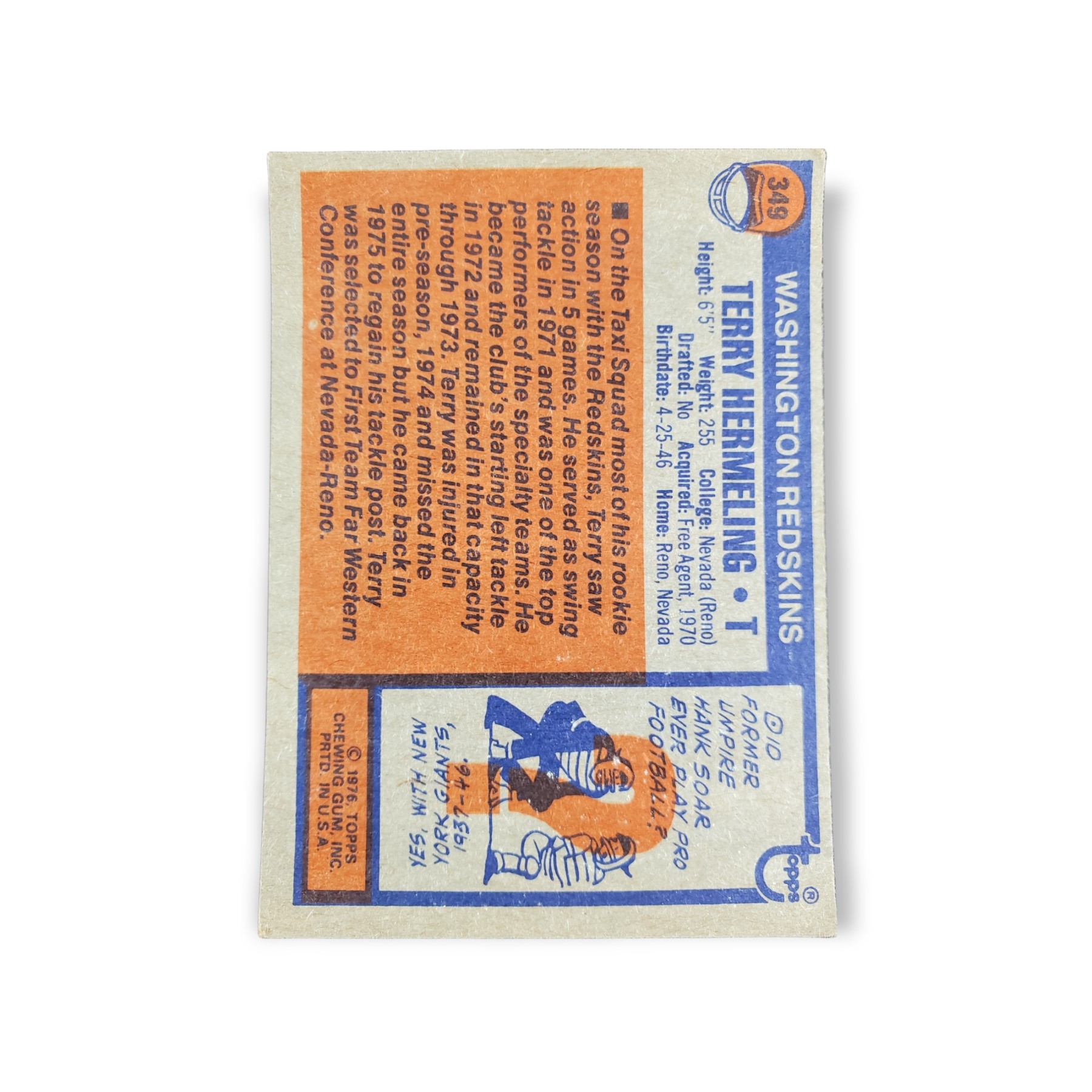 1976 Topps Football Terry Hermeling Rookie Card #349 Washington Redskins Trading Card