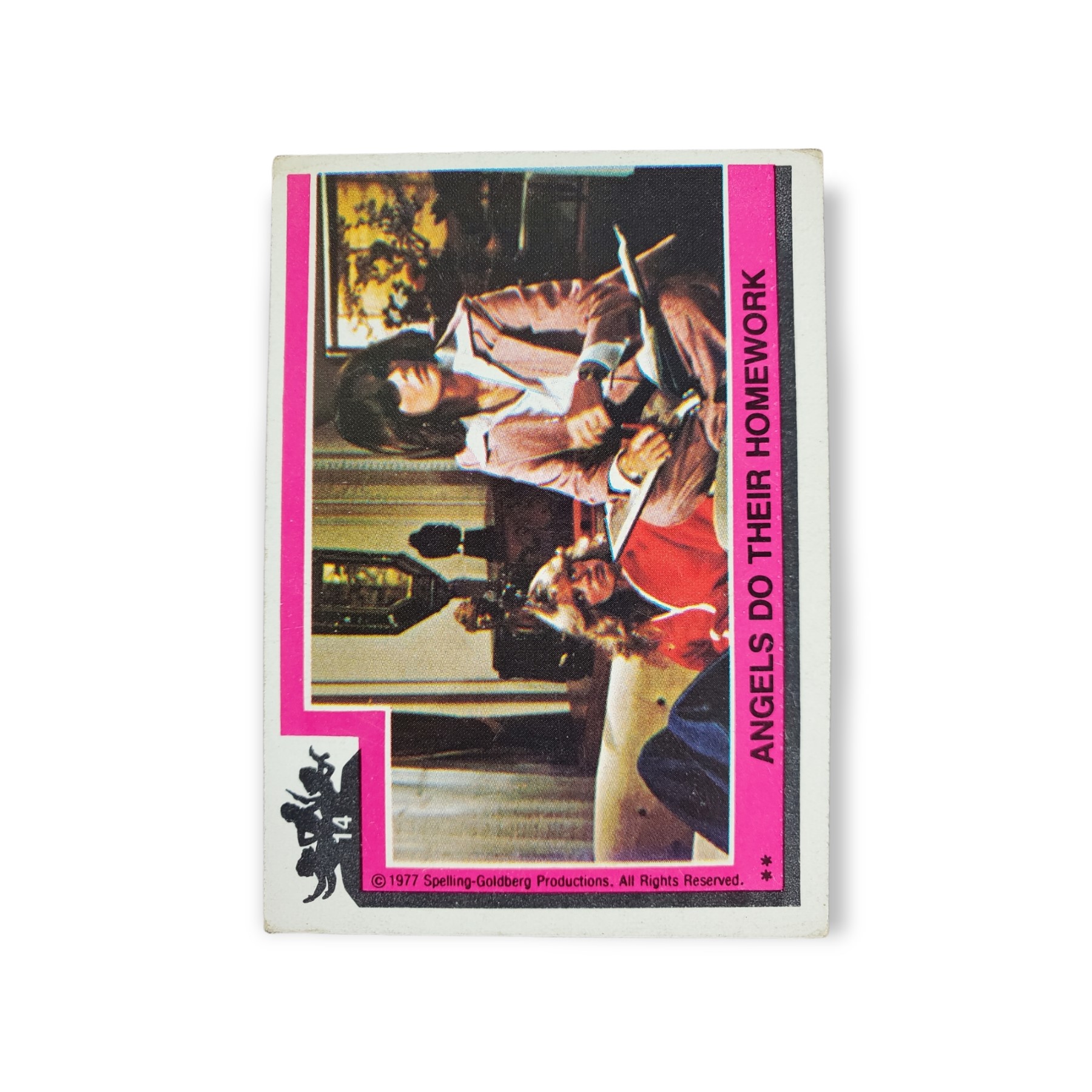 1977 Topps Charlies Angels Series 1 Trading Card #14 Angels Do Their Homework – Two asterisk (**) variation on the front of card. The back of the card features a puzzle piece.