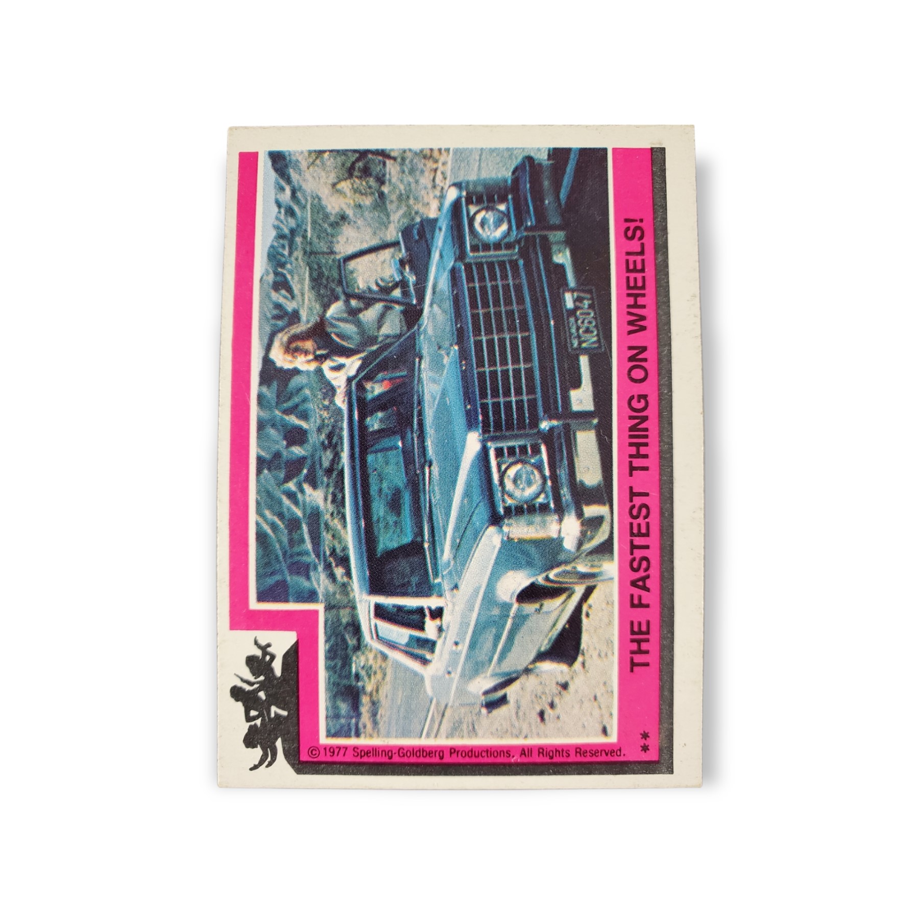 1977 Topps Charlies Angels Series 1 Trading Card #7 The Fastest Thing On Wheels! – Two asterisk (**) variation on the front of card. The back of the card features a puzzle piece.