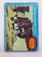 1977 Topps Star Wars Series 1 Trading Card #11 Blue Border – Artoo is imprisoned by the Jawas. The back of the card has a red X written in crayon. The Series 1 set is based on Star Wars: Episode IV A New Hope, and featured stills from the film, promotional photos and behind the scenes photos, all within a blue starfield border. Backs of the cards featured “Story Summary” or “Movie Facts” themes, or included a portion of a larger image that could be pieced together with other cards like a puzzle.