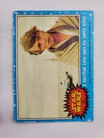1977 Topps Star Wars Series 1 Trading Card #26 Blue Border – A horrified Luke sees his family killed. The Series 1 set is based on Star Wars: Episode IV A New Hope, and featured stills from the film, promotional photos and behind the scenes photos, all within a blue starfield border. Backs of the cards featured “Story Summary” or “Movie Facts” themes, or included a portion of a larger image that could be pieced together with other cards like a puzzle.