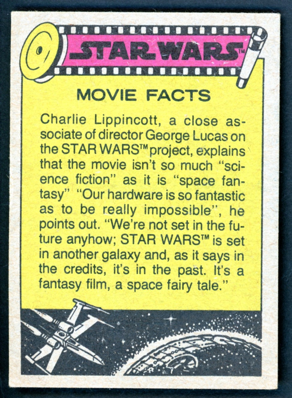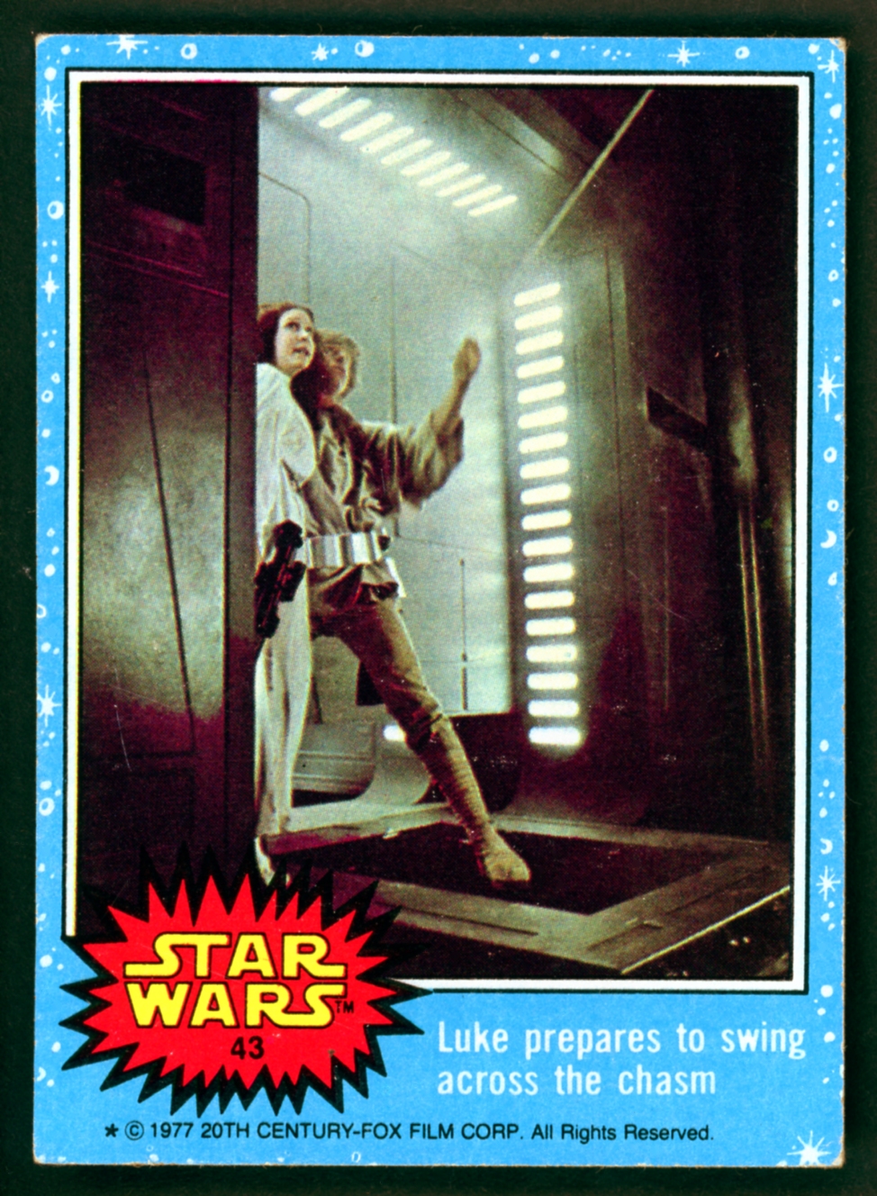 1977 Topps Star Wars Series 1 Trading Card #43 Blue Border – Luke prepares to swing across the charm. The Series 1 set is based on Star Wars: Episode IV A New Hope, and featured stills from the film, promotional photos and behind the scenes photos, all within a blue starfield border. Backs of the cards featured “Story Summary” or “Movie Facts” themes, or included a portion of a larger image that could be pieced together with other cards like a puzzle.