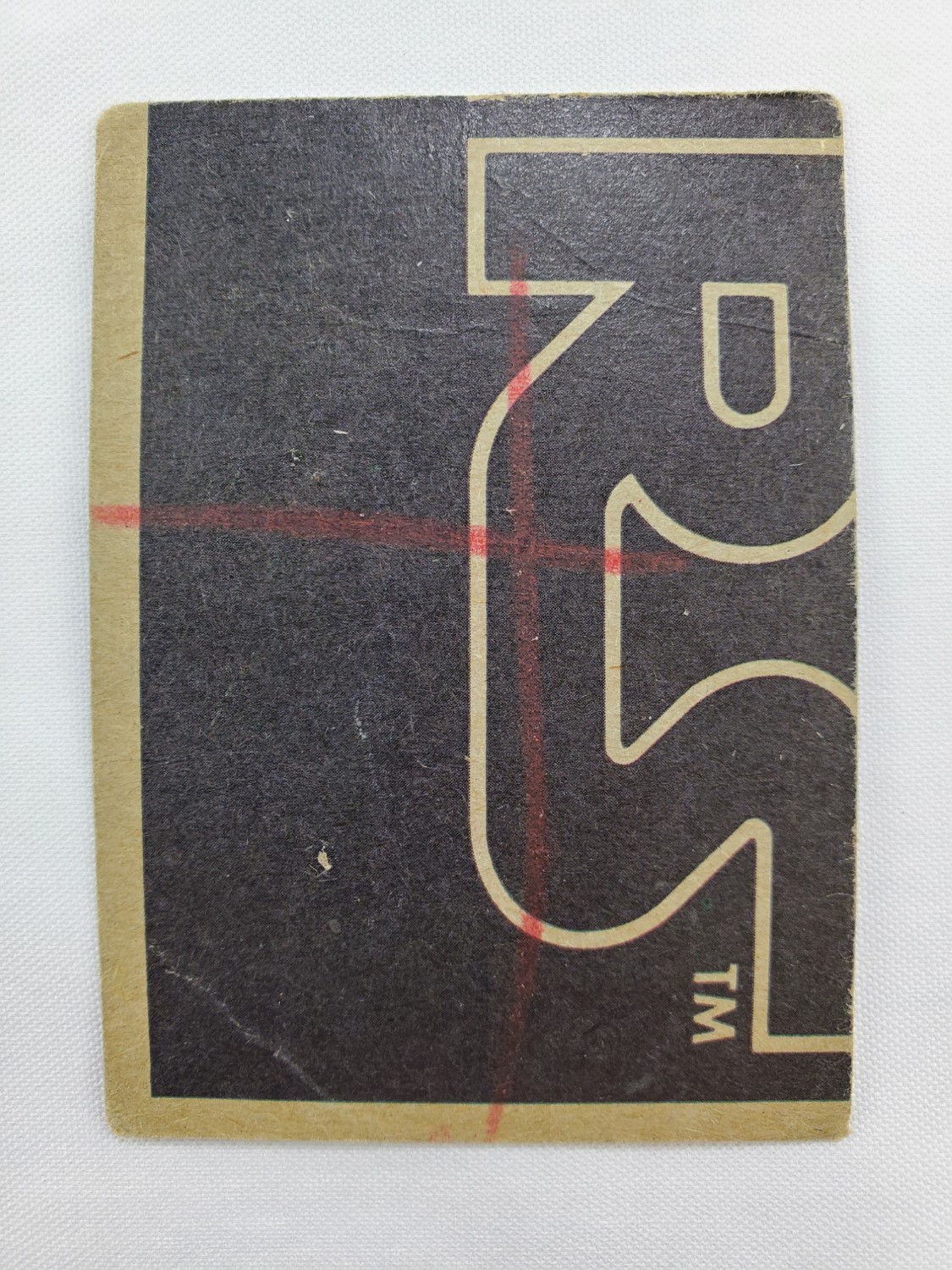 1977 Topps Star Wars Series 1 Trading Card #21 Blue Border – The Tusken Raiders. The back of the card has a red X written in crayon. The Series 1 set is based on Star Wars: Episode IV A New Hope, and featured stills from the film, promotional photos and behind the scenes photos, all within a blue starfield border. Backs of the cards featured “Story Summary” or “Movie Facts” themes, or included a portion of a larger image that could be pieced together with other cards like a puzzle.