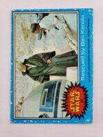 1977 Topps Star Wars Series 1 Trading Card #22 Blue Border – Rescued by Ben Kenobi. The Series 1 set is based on Star Wars: Episode IV A New Hope, and featured stills from the film, promotional photos and behind the scenes photos, all within a blue starfield border. Backs of the cards featured “Story Summary” or “Movie Facts” themes, or included a portion of a larger image that could be pieced together with other cards like a puzzle.