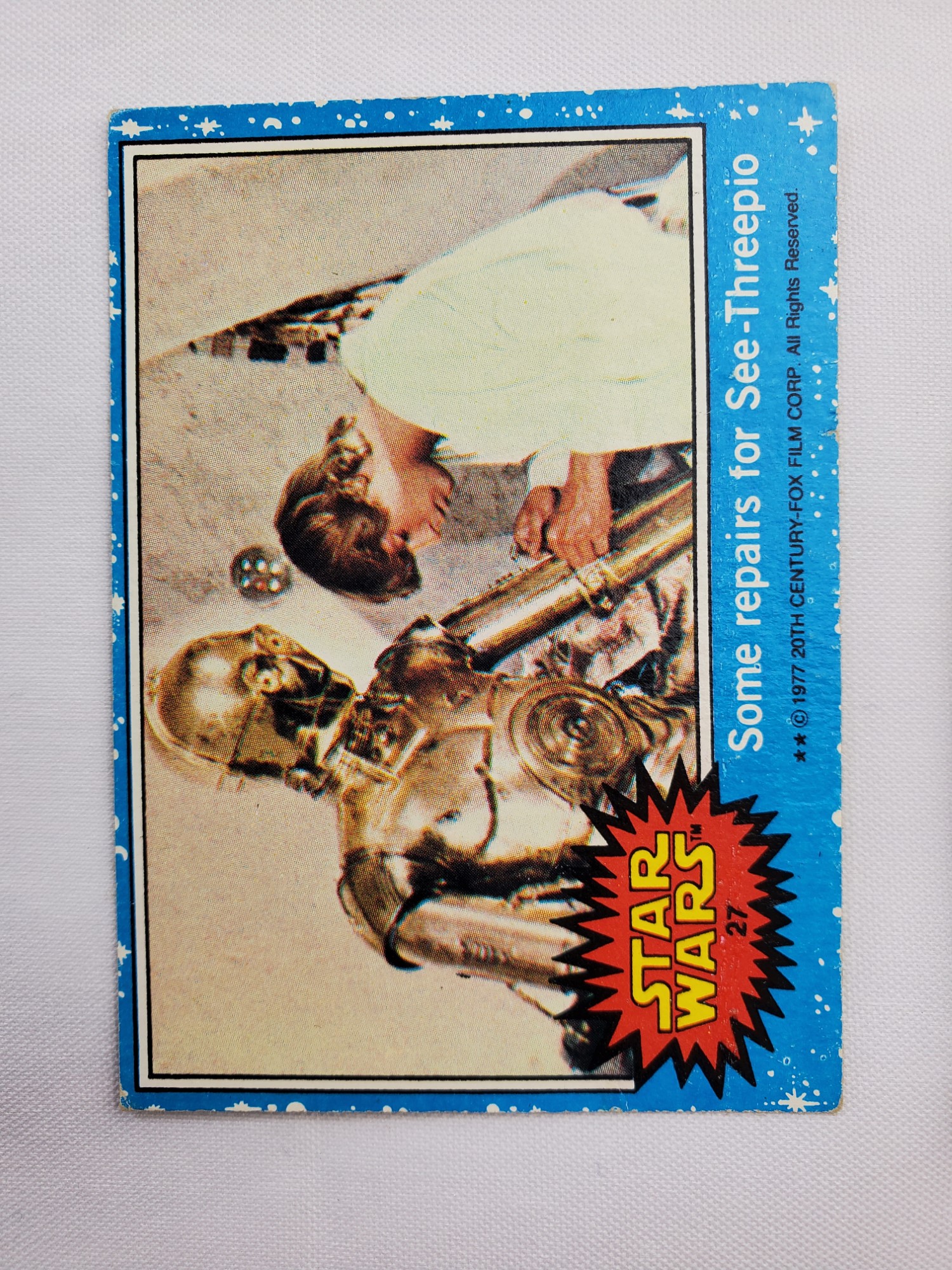 1977 Topps Star Wars Series 1 Trading Card #27 Blue Border – Some repairs for See-Threepio. The Series 1 set is based on Star Wars: Episode IV A New Hope, and featured stills from the film, promotional photos and behind the scenes photos, all within a blue starfield border. Backs of the cards featured “Story Summary” or “Movie Facts” themes, or included a portion of a larger image that could be pieced together with other cards like a puzzle.
