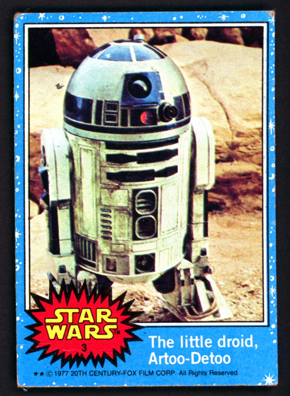 1977 Topps Star Wars Series 1 Trading Card #3 Blue Border – The little droid Artoo-Detoo. The Series 1 set is based on Star Wars: Episode IV A New Hope, and featured stills from the film, promotional photos and behind the scenes photos, all within a blue starfield border. Backs of the cards featured “Story Summary” or “Movie Facts” themes, or included a portion of a larger image that could be pieced together with other cards like a puzzle.