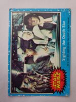1977 Topps Star Wars Series 1 Trading Card #31 Blue Border – Sighting the Death Star. The Series 1 set is based on Star Wars: Episode IV A New Hope, and featured stills from the film, promotional photos and behind the scenes photos, all within a blue starfield border. Backs of the cards featured “Story Summary” or “Movie Facts” themes, or included a portion of a larger image that could be pieced together with other cards like a puzzle.