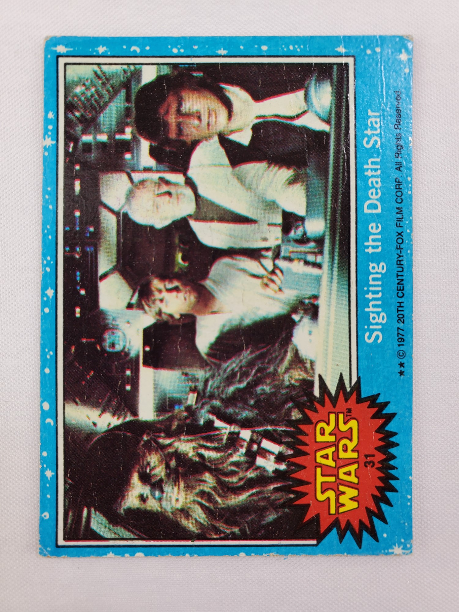 1977 Topps Star Wars Series 1 Trading Card #31 Blue Border – Sighting the Death Star. The Series 1 set is based on Star Wars: Episode IV A New Hope, and featured stills from the film, promotional photos and behind the scenes photos, all within a blue starfield border. Backs of the cards featured “Story Summary” or “Movie Facts” themes, or included a portion of a larger image that could be pieced together with other cards like a puzzle.