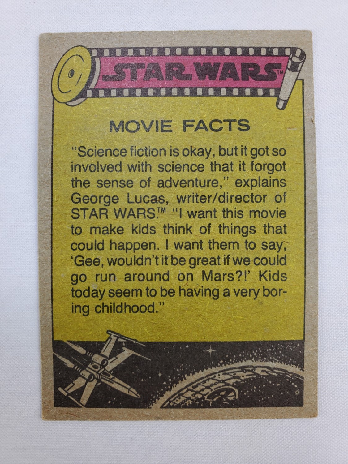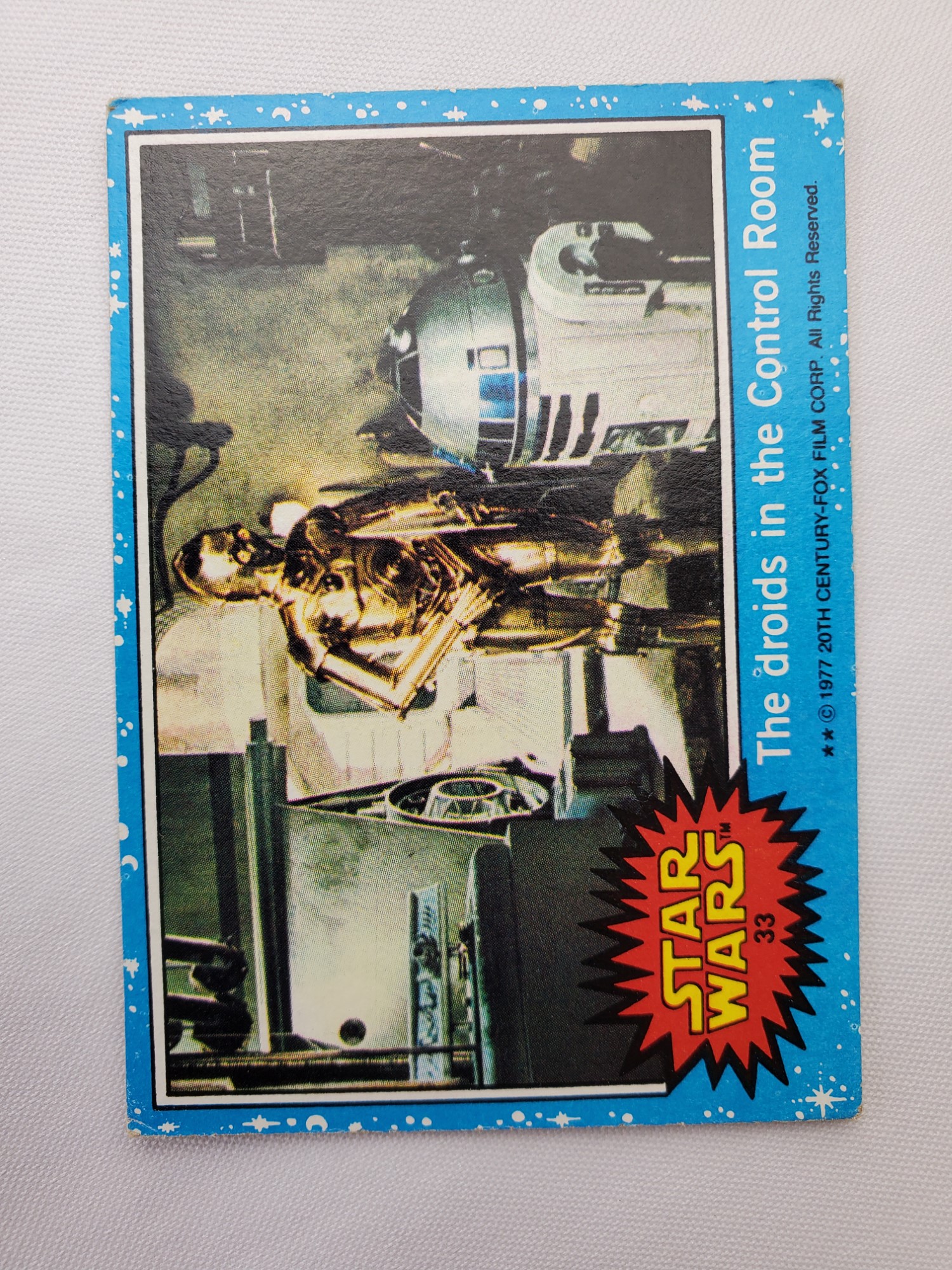 1977 Topps Star Wars Series 1 Trading Card #33 Blue Border – The droids in the Control Room. The Series 1 set is based on Star Wars: Episode IV A New Hope, and featured stills from the film, promotional photos and behind the scenes photos, all within a blue starfield border. Backs of the cards featured “Story Summary” or “Movie Facts” themes, or included a portion of a larger image that could be pieced together with other cards like a puzzle.