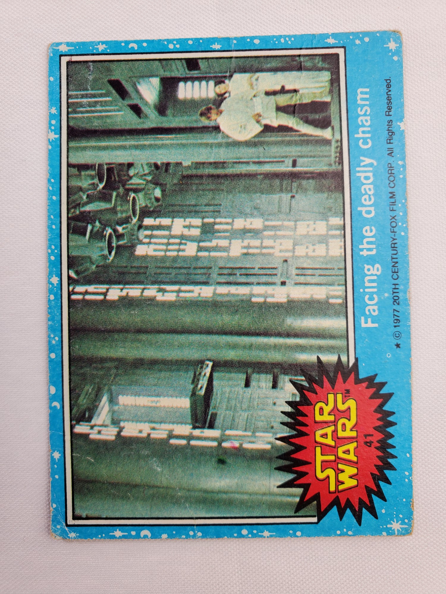 1977 Topps Star Wars Series 1 Trading Card #41 Blue Border – Facing the deadly chasm. The Series 1 set is based on Star Wars: Episode IV A New Hope, and featured stills from the film, promotional photos and behind the scenes photos, all within a blue starfield border. Backs of the cards featured “Story Summary” or “Movie Facts” themes, or included a portion of a larger image that could be pieced together with other cards like a puzzle.