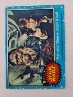 1977 Topps Star Wars Series 1 Trading Card #44 Blue Border – Han and Chewie shoot it out! The Series 1 set is based on Star Wars: Episode IV A New Hope, and featured stills from the film, promotional photos and behind the scenes photos, all within a blue starfield border. Backs of the cards featured “Story Summary” or “Movie Facts” themes, or included a portion of a larger image that could be pieced together with other cards like a puzzle.