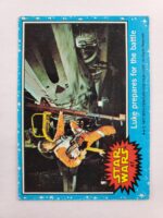 1977 Topps Star Wars Series 1 Trading Card #47 Blue Border – Luke prepares for the battle. The Series 1 set is based on Star Wars: Episode IV A New Hope, and featured stills from the film, promotional photos and behind the scenes photos, all within a blue starfield border. Backs of the cards featured “Story Summary” or “Movie Facts” themes, or included a portion of a larger image that could be pieced together with other cards like a puzzle.