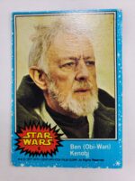 1977 Topps Star Wars Series 1 Trading Card #6 Blue Border – Ben (Obi-Wan) Kenobi. The Series 1 set is based on Star Wars: Episode IV A New Hope, and featured stills from the film, promotional photos and behind the scenes photos, all within a blue starfield border. Backs of the cards featured “Story Summary” or “Movie Facts” themes, or included a portion of a larger image that could be pieced together with other cards like a puzzle.