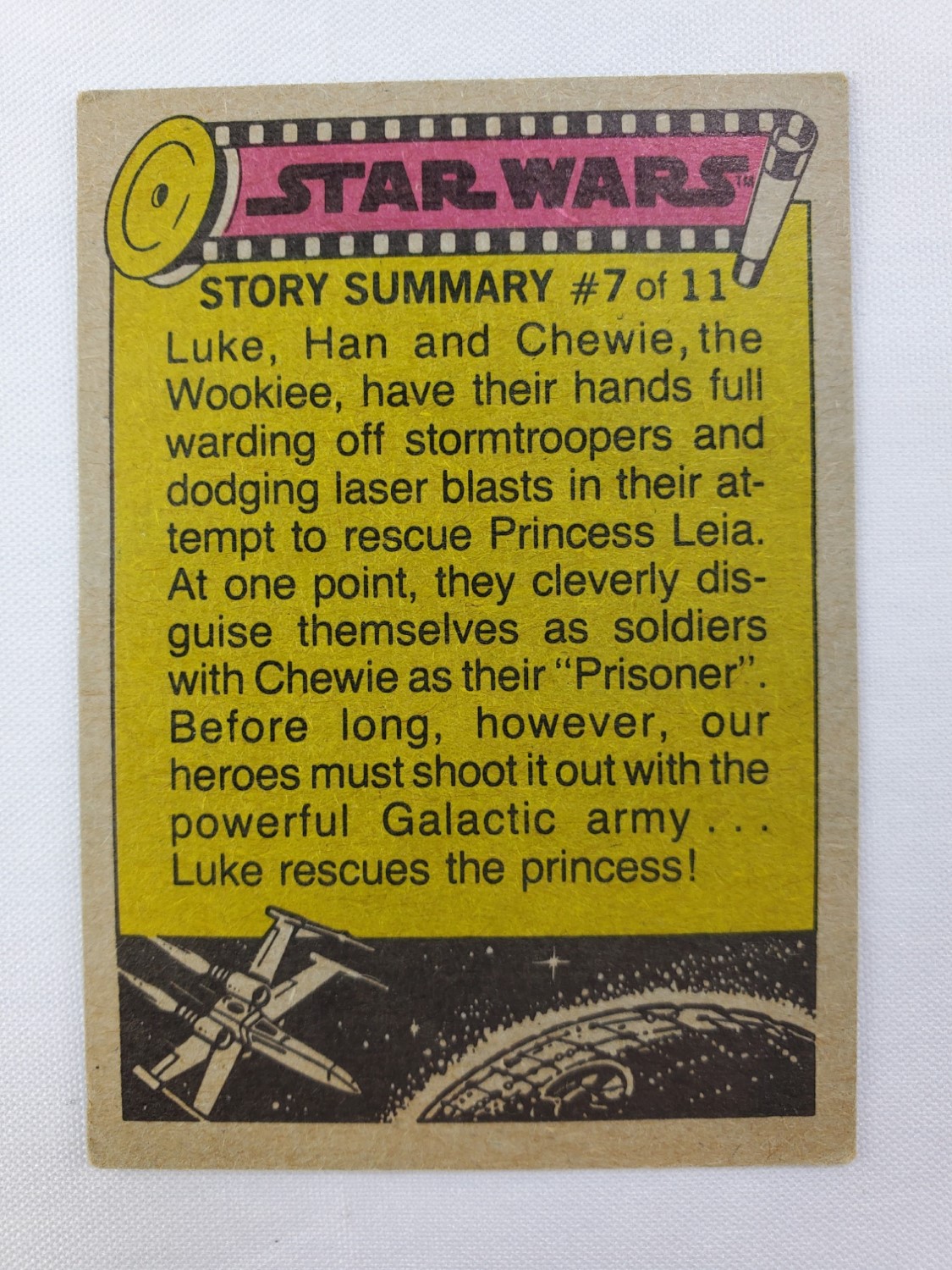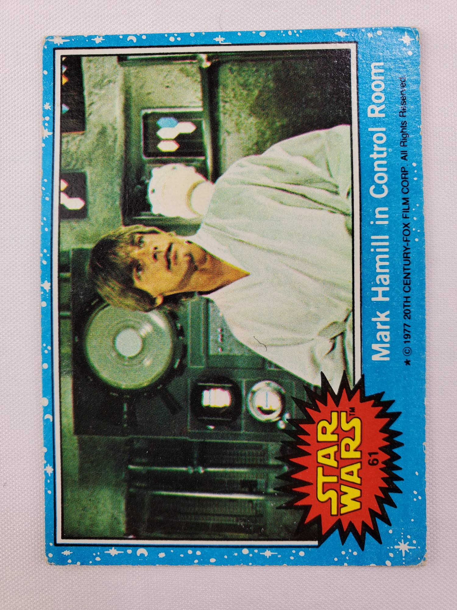 1977 Topps Star Wars Series 1 Trading Card #61 Blue Border – Mark Hamill in Control Room. The Series 1 set is based on Star Wars: Episode IV A New Hope, and featured stills from the film, promotional photos and behind the scenes photos, all within a blue starfield border. Backs of the cards featured “Story Summary” or “Movie Facts” themes, or included a portion of a larger image that could be pieced together with other cards like a puzzle.