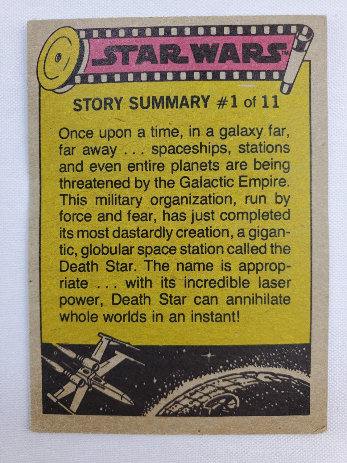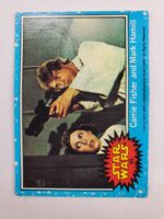 1977 Topps Star Wars Series 1 Trading Card #65 Blue Border – Carrie Fisher and Mark Hamill. The Series 1 set is based on Star Wars: Episode IV A New Hope, and featured stills from the film, promotional photos and behind the scenes photos, all within a blue starfield border. Backs of the cards featured “Story Summary” or “Movie Facts” themes, or included a portion of a larger image that could be pieced together with other cards like a puzzle.